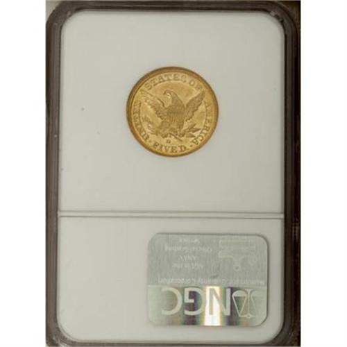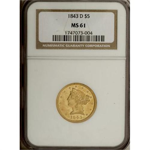 <B>1843-D $5 Small D MS61 NGC.</B></I> Variety 10-G. The Small D variety is considerably rarer than the usually seen Medium D. NGC did not designate the Small D variety on the holder, nor do they list any examples of the Small D in their Census data. The different mintmark sizes on the 1843-D half eagle should be considered significant varieties. In fact, PCGS actually does distinguish between the two varieties.<BR> This specimen is a gorgeous, sharply detailed Mint State piece. The surfaces have the usual grade limiting abrasions that are typical of the MS61 level, but few on either side are of any significance. A tiny obverse rim mark is evident at 2 o'clock. Both sides have fully brilliant light yellow-gold luster.<BR> It is not immediately known where this piece fits in the overall census of the variety, although a few finer examples of the <I>date </B></I>are known. However, we would not be surprised to learn that this specimen ranks among the finest 1843 Small D half eagles. For comparison, the Harry Bass Collection included three examples, a MS60 with granular surfaces, a certified AU55, and an uncertified AU50. This piece is clearly finer than any of the Bass coins.<BR><BR><b>Shipping:</b> Coins & Currency (<a target="_blank" href="http://www.heritageauctions.com/common/shipping.php">view shipping information</a>)