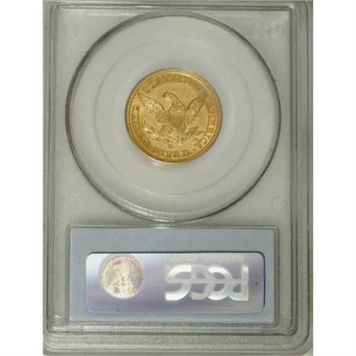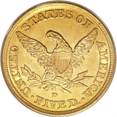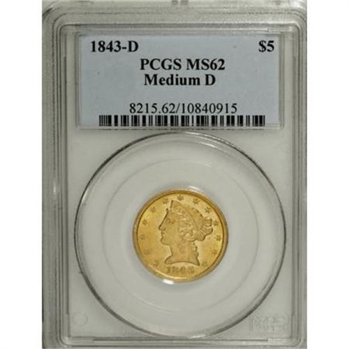 <B>1843-D $5 Small D MS62 PCGS.</B></I> Variety 10-G. While the PCGS holder lists this piece as a Medium D, the position of the mintmark and its size identify it as the significantly more elusive Small D variety. The Medium D reverse has a mintmark above the gap between the V and E of FIVE, while the mintmark on the present coin is over the right side of the V exclusively, consistent with the Small D reverse. The surfaces of this immensely appealing example offer vibrant luster, slightly reflective in the centers with frosty margins. The color on the piece is beautiful, with peripheral orange-tinged haze that frames rich yellow-gold interiors. Lightly abraded in the fields but with a clean appearance overall, this coin is impressive for the grade.<BR> This MS62 Small D piece is clearly among the finest known. The highest-graded Small D example graded by PCGS is a lone MS61, though the other MS62 Medium D half eagle and the four finer representatives of that variety must be considered suspect (7/07). In addition, NGC does not distinguish the Medium D and Small D variants, so one of the three Select pieces or the Choice coin at that service might be a Small D as well. Regardless, this gorgeous coin is an important example that could find a home in the finest cabinet of Dahlonega gold.<BR><BR><b>Shipping:</b> Coins & Currency (<a target="_blank" href="http://www.heritageauctions.com/common/shipping.php">view shipping information</a>\)