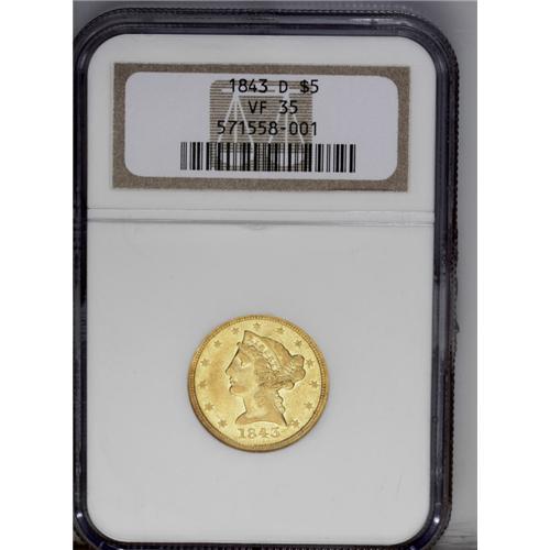 <B>1843-D $5 Medium D VF35 NGC.</B></I> Variety 10-H. Despite the VF35 grade, luster remnants are unmistakable within the legends and device crevices. The eagle is richly detailed, while the highpoints of the portrait are blunt, from a combination of wear and a soft strike. A few marks are present, but the overall appearance is bright and attractive.<BR><I>From The Jones Beach Collection.</B></I><BR><BR><b>Shipping:</b> Coin/Currency (<a target="_blank" href="http://www.heritageauctions.com/common/shipping.php">view shipping information</a>)