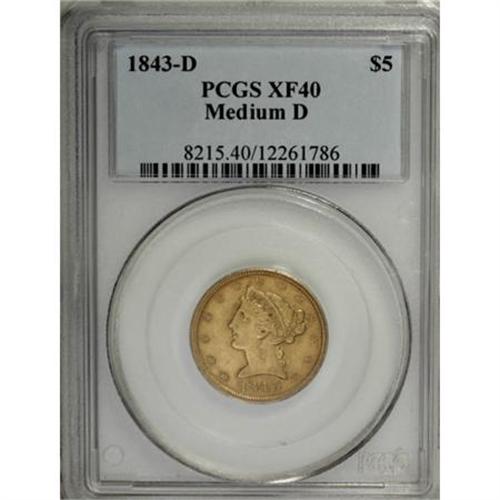 <B>1843-D $5 Medium D XF40 PCGS.</B></I> Variety 10-H. Medium D. Three tiny die lumps are located between the first and second obverse stars, with others noted below the 12th star and above 43 in the date. Very well struck, for a Dahlonega Mint product, with just a bit of weakness observed on the eagle's arrow fletchings. The surfaces are free of individually mentionable marks, and the highpoints only display a modest degree of wear for the grade. <BR><I>From The John Stimson, Sr. Collection, Part Two.</B></I><BR><BR><B>Coin Engraver:</B> Christian Gobrecht<BR><BR><b>Shipping:</b> Coins & Currency (<a target="_blank" href="http://www.heritageauctions.com/common/shipping.php">view shipping information</a>)