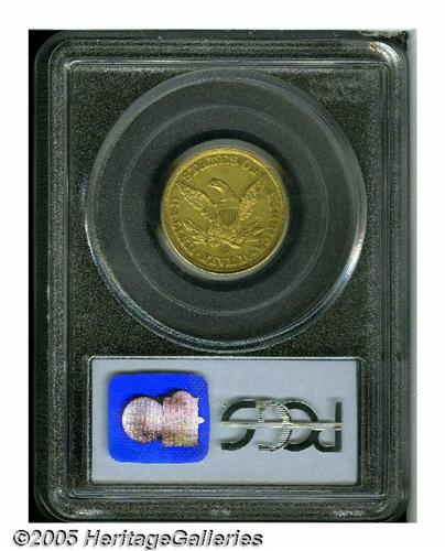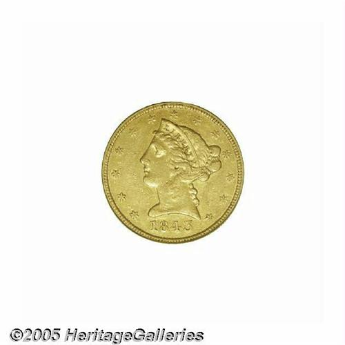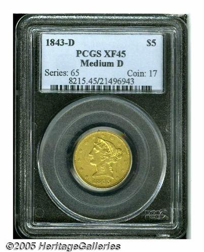 <B>1843-D<$5> Medium D XF45 PCGS.</B></I> Variety 10-H. If the mintage figures provide an accurate window to rarity, this is one of the most common of all Dahlonega gold coins. In fact, the mintage of 98,452 coins is the single highest annual production of any issue at the Dahlonega Mint, including all three denominations. This variety was described as "Large D" by Walter Breen, and it is the usually seen die variety of the date. Many collectors seek just one gold coin from the Dahlonega Mint, representative of the charm of the South. This is an ideal example for those collectors. The strike is not full, or even sharp, but it is clearly finer than usual. The surfaces are only lightly abraded, and attractive green-gold color is displayed.