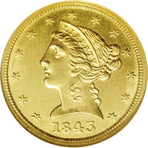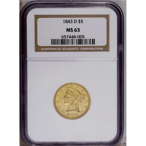 1843-D $5 Small D MS63 NGC. Variety 10-G. The variety 1843-D[$5] Small D MS63 NGC.