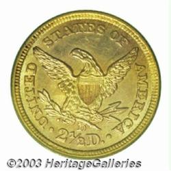 1843-D Small D $2 1/2MS63 PCGS. Variety 4-F. (per Doug Winter's second edition and revised attribution system). Small mintmark; reverse of 1842. The most common of the three small mintmark varieties of this year. Easily identifiable by a reverse die crack through the F in OF.RARITY INFORMATION: The 1843-D is the most available quarter eagle from the Dahlonega mint. It is relatively easy to locate in lower grades and only moderately scarce in the lower About Uncirculated grades but it becomes very scarce in AU55 or better. It is very rare and much underrated in Uncirculated with just four or five pieces known. As of November 2003 this particular coin is one of two graded MS63 by PCGS with none better.STRIKE: The strike is extremely sharp with the hair above the ear of Liberty completely defined. There are also full radial lines in the stars, complete wing tips and no weakness on the eagle's legs. This is generally a well struck issue but this is still one of the better detailed 1843-D quarter eagles we can recall having seen.SURFACES: A few very light hairlines (not from cleaning) lie on the surfaces. There are no really noticeable marks other than some faint mint-made clashmarks in the right obverse field and a shallow, easily-missed dig to the right of star 11. As a rule, this date is generally found with very heavily marked surfaces.LUSTER: The luster is frosty with the fields showing a slightly different, semi-prooflike texture than the borders which are of a more grainy texture.COLORATION: As sometimes seen on 1843-D quarter eagles, the coloration on this piece has a two-toned appearance with light green-gold centers framed by rings of deeper orange-gold at the peripheries. This color is quite attractive and is original. It is far more appealing than usual for this issue.EYE APPEAL: This is an extremely pleasing 1843-D quarter eagle. It has a full strike with nice color over clean, original surfaces.COMPARABLES: It does not appear that an 1843-D graded higher than MS61 by a major third-party service has sold at auction in the past fifteen years. We auctioned a PCGS MS61 in our 1999 FUN sale that brought $14,950.PEDIGREE: Obtained from Doug Winter at the 2000 ANA convention in Philadelphia; Ex: Bob Harwell/Jeff Garrett; 1999 ANA Sale (Heritage, 8/99), lot 7641; Chestatee Collection; Hancock and Harwell; Michigan Collection; Stack's (10/91), lot 1830. This is the plate coin in the second edition of the Winter book on Dahlonega gold and it is listed in the current Condition Census as the finest known 1843-D quarter eagle. Important notice: Heritage usually auctions material at the rate of 200-250 lots per hour. On some occasions eBay Live bid software or the Internet may not be able to keep up with the pace of the auction. We recommend placing a realistic absentee bid now as insurance to avoid disappointment. Occasionally the auctioneer may eliminate or reject an eBay Live bid, and the auctioneer may also reopen a lot after the close of the eBay live bidding (usually because we missed an audience bid), and may reject your bid even if it shows you as the winning bidder. By bidding via eBay Live, you agree that Heritage may award the lot to another bidder at its sole discretion under the circumstances described above or any other reasonable circumstances. Also please note that all Heritage lots purchased through eBay Live carry a 20% Buyer's Premium. Please make sure you read the Terms and Conditions before you bid.
