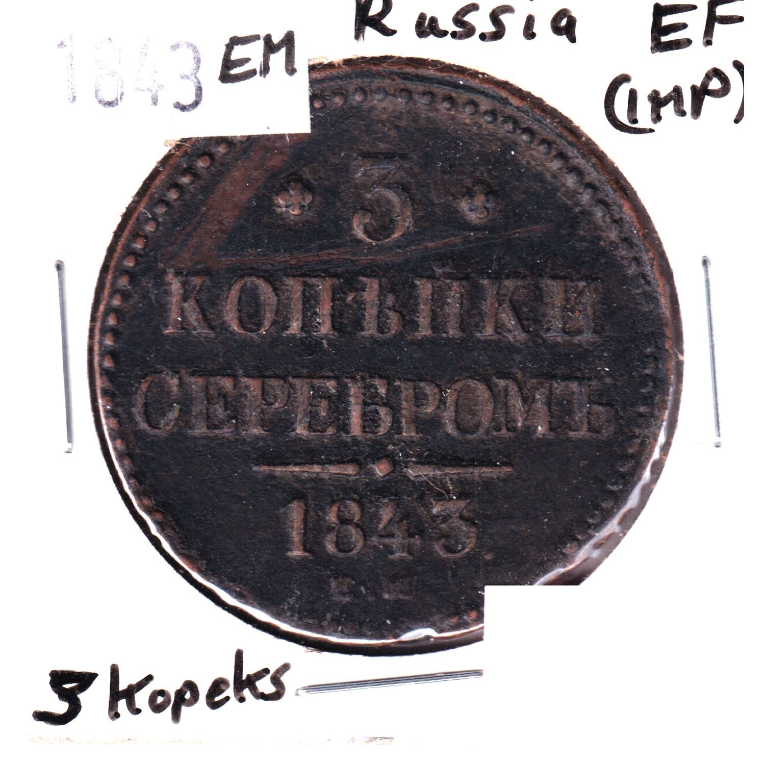 1843 EM Russia 3 Kopeks EF (impaired)