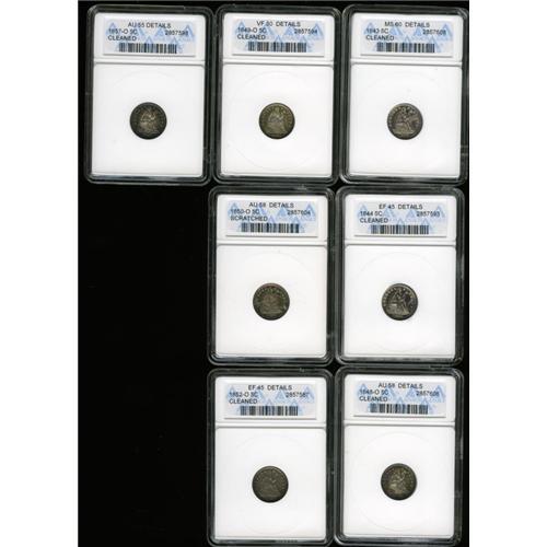 <B>1843<H10C>--Cleaned--ANACS, MS60 Details,</B></I> medium ice-blue and walnut-brown toning, only lightly cleaned; <B>1844--Cleaned--ANACS, XF45 Details,</B></I> unnaturally bright and prooflike, gold and powder-blue tints, repunched date; <B>1848-O--Cleaned--ANACS, AU58 Details,</B></I> glossy fields, rich sea-green borders; <B>1849-O--Cleaned--ANACS, VF30 Details,</B></I> granular and hairlined with bright multicolor toning, a few pinscratches; <B>1850-O--Scratched--ANACS, AU58 Details,</B></I> a bright rainbow-toned piece with two noticeable obverse pinscratches that approach at 3 o'clock; <B>1852-O--Cleaned--ANACS, XF45 Details,</B></I> a bright and somewhat abraded example with orange and lime hues; and an <B>1857-O--Cleaned--ANACS, AU55 Details,</B></I> lightly cleaned, wispy marks on the left obverse field, rich green-gold margins.