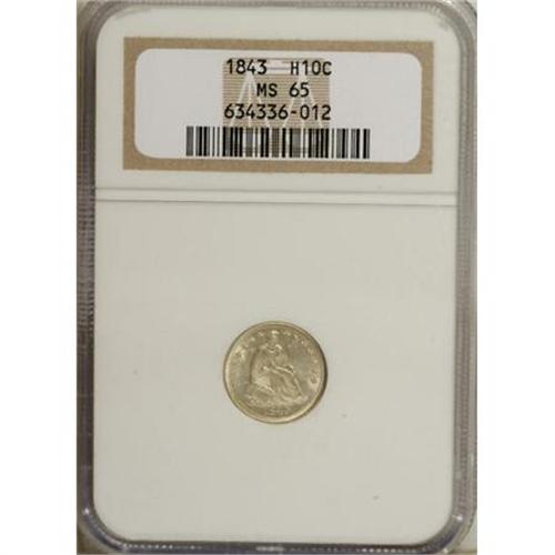 <B>1843 H10C MS65 NGC.</B></I> A shining, enticing Gem representative of this early half dime issue, solidly struck with hints of peach and gold patina. Carefully preserved and exquisite. Census: 22 in 65, 9 finer (7/07).<BR><BR><B>Coin Engraver:</B> Christian Gobrecht<BR><BR><b>Shipping:</b> Coins & Currency (<a target="_blank" href="http://www.heritageauctions.com/common/shipping.php">view shipping information</a>)