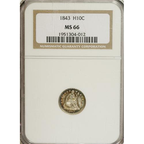 <B>1843 H10C MS66 NGC.</B></I> Highly lustrous with orange peripheral toning and a trace of ruby-red and ocean-blue at the rims. Sharply struck with immense overall eye appeal. The reverse features three heavy die cracks. Census: 9 in 66, 0 finer (4/07).<BR><BR><b>Shipping:</b> Coins & Currency (<a target="_blank" href="http://www.heritageauctions.com/common/shipping.php">view shipping information</a>)