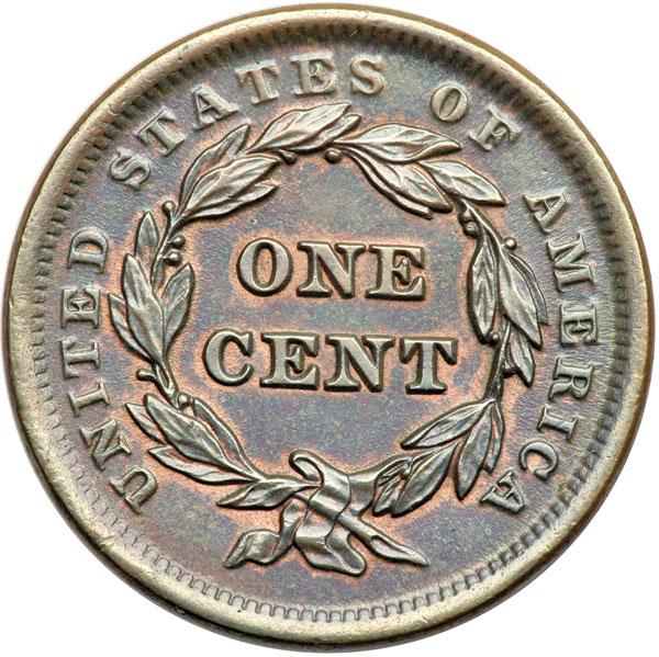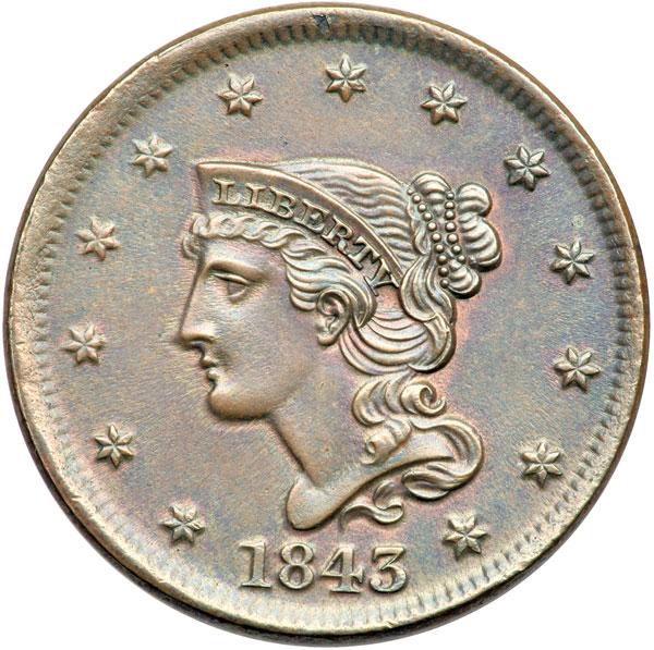 1843 N-10 R3 AU50. Sharpness very close to mint state but lightly cleaned and retoned glossy bluish steel brown and chocolate with traces of frosty faded red in protected areas. No other defects. Looks mint state. LDS, die state b. The short point up from the top of the E in CENT is gone and two tiny lumps now show under that N. DWH #0917.