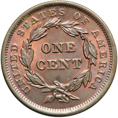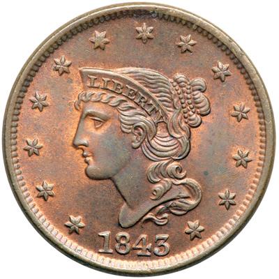 1843 N-11 R2 MS63. MS-63. Obverse and Reverse of 1842. Repunched 184. Lustrous mint red fading to bluish steel and olive brown with a third of the mint color remaining. This cent is virtually flawless except for a splash of dark toning under the E in CENT and a couple smaller ones at TA in STATES. The surfaces are satiny and the eye appeal is excellent. MDS, die state c early. A die crack extends from the rim through the I in AMERICA to the wreath but goes no farther. Repunching remains visible on the 184. Tied for CC#2 honors in the Grellman census.