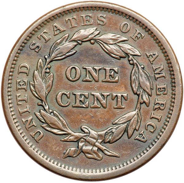 1843 N-11 R2- VF30. Glossy medium brown and chocolate with a swipe of darker chocolate across the upper reverse. A dull, light nick under star 8 is the notable mark. E-MDS, die state b. The reverse is uncracked and the rectangular depression at the inner curl is weak but visible. DWH #0919.