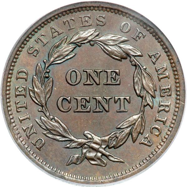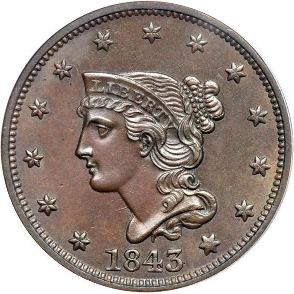 1843 N-12 R1 PCGS graded MS64 Brown. Very attractive lustrous medium chocolate and steel brown. The surfaces are satiny and virtually flawless. No spots, stains, or contact marks. The only defect is a barely visible planchet flake on the rim over UN in UNITED, as struck. Sharply struck EDS, die state a. All the fine die finishing lines are crisp. Our grade is MS63, tied for CC#4 in the Grellman census. The attribution is noted on the PCGS label. Pop 1; 1 finer in 65BN.