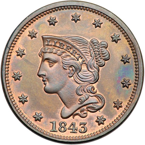1843 N-14 R6+ Proof-Only. PCGS graded Proof 64 Red & Brown. Medium brown with steel brown highpoints and 15% of the mellowed mint red remaining on the obverse, 30% on the reverse. The fields are nicely reflective with moderate to deep mirrors. There is an area of iridescent bluish steel and rose tones around star 11, a question mark-shaped struck through line above star 4, and a tiny planchet fissure on the rim left of that star, as struck. Sharply struck with excellent eye appeal. Called Proof-64 and CC#2 in the Denis Loring census. Our grade is Proof-63, tied for CC#2 in the Grellman census. Either way this example is one of the finest known of this very rare proof-only variety. And it has passed through the hands of several prominent large cent specialists. The attribution and Dan Holmes provenance are noted on the PCGS label. PCGS population 1; the only Proof graded at PCGS for the variety. DWH #1855 (PCGS # 408565) .