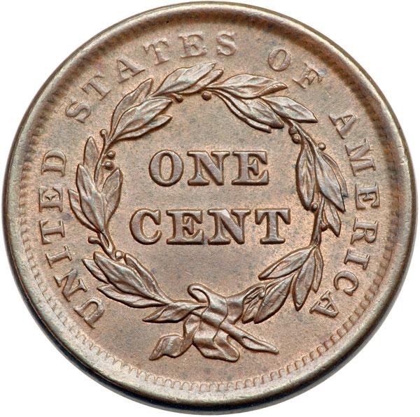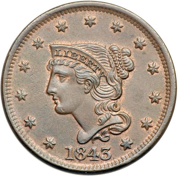 1843 N-15 R3 MS60. Frosty light to medium steel brown with at least 5% of the mint red remaining on each side. There is a dull, light nick on the chin and a small carbon spot below the junction of the T & E in UNITED. LDS, die state b late. The die lines at the inner curl are dull and the fine one at the right top of the N in ONE is gone. Tied for CC#4 in the Grellman census. DWH #2028.