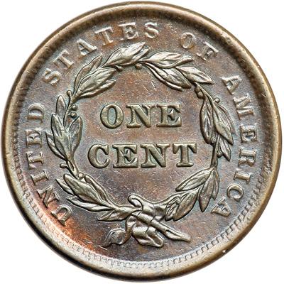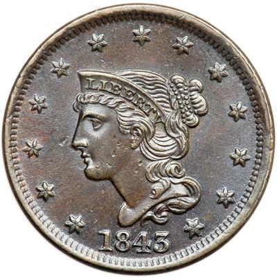 1843 N-15 R3. EF-45 Plus. Petite Head with Small Letters Reverse. Sharpness near mint state but there are a half dozen dull pinpricks or planchet chips on the cheek and upper neck plus another in the field off the tip of the nose. Highly lustrous chocolate and dark bluish steel brown with traces of mint color showing on both sides. This cent looks choice mint state except for the pinpricks/chips, but they can't be ignored. LDS, die state b. Both dies are well worn and the fine die line at the N in ONE is gone.
