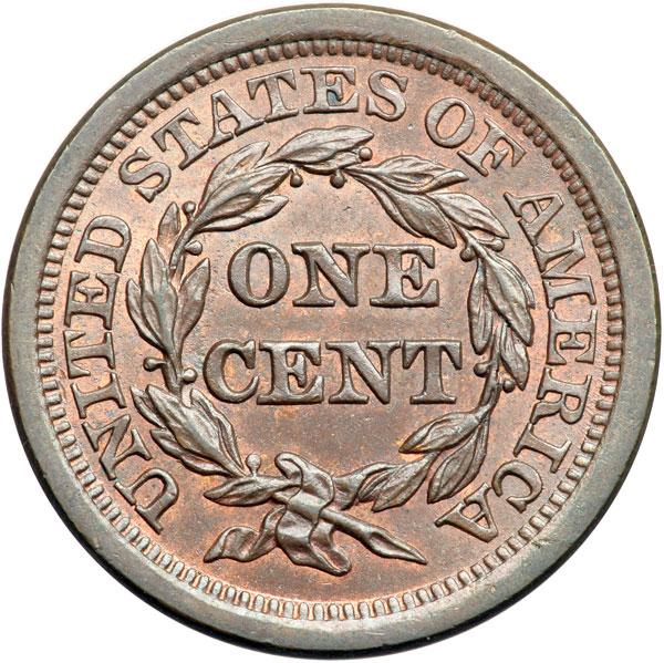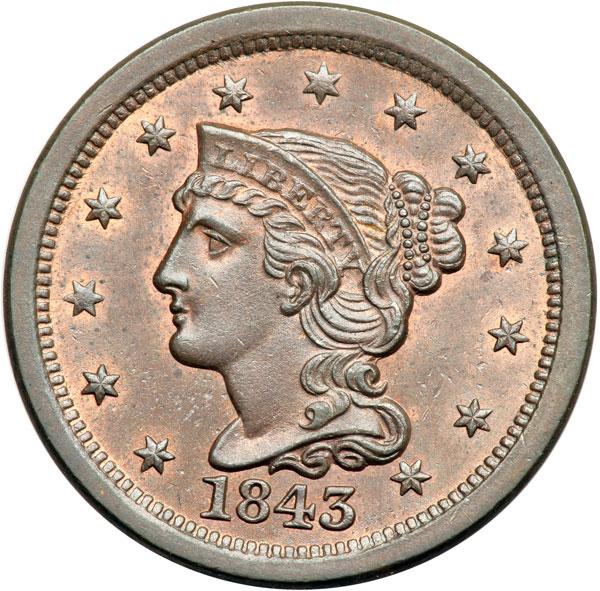 1843 N-16 R4 Mature Head MS63. Frosty light to medium steel brown with 25% of the original mint color remaining, mostly on the obverse. There is a tiny nick on the coronet over B and a very tiny rim nick above the O in OF, neither defect at all distracting. The obverse fields show several very tiny lint marks where specks of debris were stuck on the die. Otherwise sharply struck E-MDS, die state a (there is no state b). All the fine die lines and points are clear and the fields are satiny from microscopic die flowlines. A beautiful cent offering excellent eye appeal for the grade. Tied for finest known honors with two other examples in the Grellman census. DWH #2029.