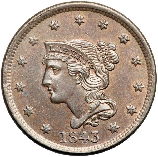 1843 N-2 R1 MS63. Lustrous bluish steel brown with very faded mint red covering the protected areas, especially on the reverse. The surfaces are very attractive and nearly flawless. The best identifying marks are a small spot of darker toning (not carbon) close under the right side of star 3 and another off the right top of star 7. M-LDS, die state b late (Newcomb's old #7). The die lump under the base of the 1 is gone and the point down from the left base of the N in ONE is reduced to a nub. The small rim cud break seen over UN in earlier die states does not show. Tied for CC#2 with several other examples in the Grellman census. DWH #1836.