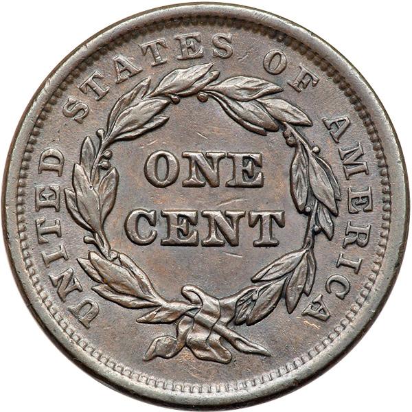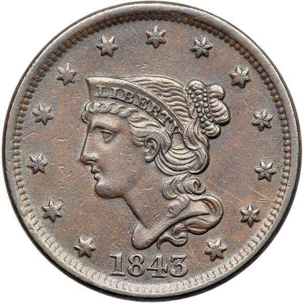 1843 N-2 R1. EF-40. Obverse and Reverse of 1842. Glossy chocolate and steel brown with delicate overtones of light bluish steel on the reverse. Satiny mint frost covers the protected areas, especially on the reverse. Only a few trivial marks, including faint abrasions tucked tight against the bottom of the wreath ribbon. MDS, die state a late. The lump under the right end of the base of the 1 is dull but remains visible.