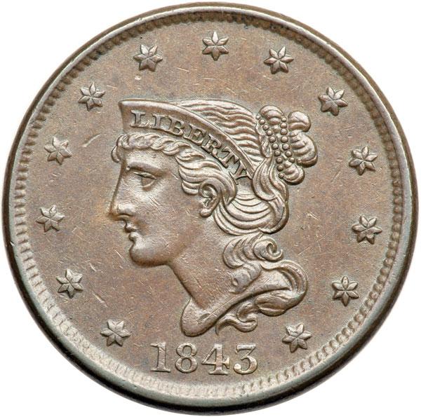 1843 N-3 R3+ EF45. Choice glossy steel brown and light chocolate with satiny luster covering the protected areas. A thin nick right of star 5 and another on the bust tip are the only notable defects. EDS, die state a. A rare die state, struck before the lump formed on top of the E in CENT. Not in the overall condition census for the variety but finest known of the earliest die state according to Grellman. DWH #0905.
