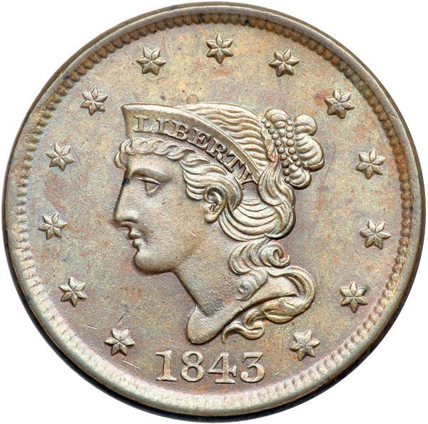 1843 N-3 R3+ MS62. The obverse is frosty light steel brown with traces of faded mint red. The reverse is glossy steel brown with 25% of the red remaining. A tiny speck of carbon on the nose before the eyelash and a small splash of reddish brown toning at the dentils under the wreath ribbon are the only notable defects, and they are trivial. The reverse is choice. MDS, die state b. The lump has formed on the top of E in CENT and the die lines over ER are dull but visible. CC#4 in the Grellman census. DWH #2024.