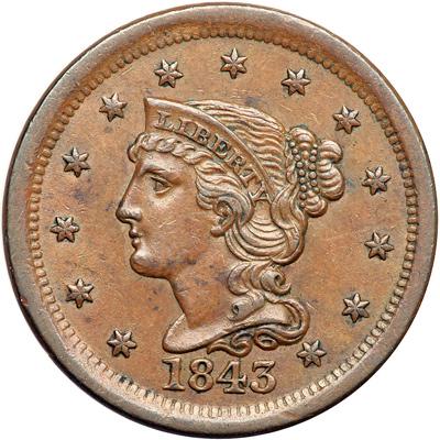 1843 N-5 R1. EF-40. Mature Head. Slightly sharper with a few minor contact marks, including a faint hairline scratch in the field before the face. Frosty medium brown with light chocolate brown toning on the highpoints and several tiny wisps of darker olive brown toning scattered over the obverse. E-MDS, die state b. The die lines over MER are visible but a bit blurry.