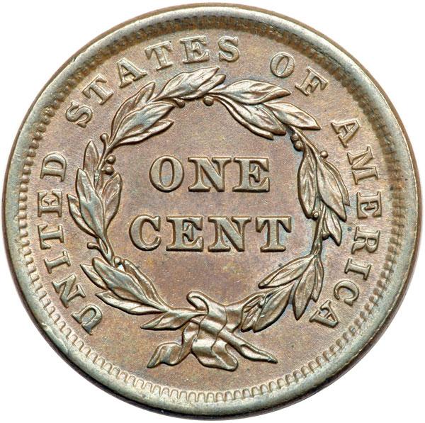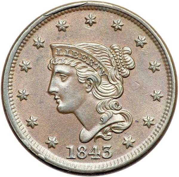 1843 N-9 R2 AU55. Frosty light brown with slightly darker steel brown toning on the highpoints and hints of very faded mint color in protected areas of the obverse. Satiny, virtually mark free with only a hint of friction on the highest points of the design. The only marks are a tiny, very light nick close under star 7 and a speck of darker olive toning left of star 12. A choice cent with mint state eye appeal. LDS, die state c, with a strong rim cud break at stars 6-7, smaller ones at stars 1-2, and a thin one at star 8, plus a clear rim cud break at the U in UNITED. The repunching under the 843 is dull but still visible. Removed from an NGC slab graded MS64BN (NGC label included, and it shows the attribution and Reiver provenance). DWH #2964.