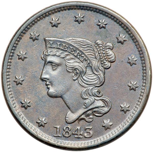 1843 N-9 R2 EF45. Frosty bluish steel and chocolate with delicate clouds of darker steel toning on the obverse and satiny mint luster in protected areas. A tiny pinprick left of star 10 is the only notable mark, and it is barely visible. M-LDS, die state c, with clear rim cud breaks at star 11 and over the U in UNITED with a weaker rim cud at stars 8 & 9. The lump under the base of the 1 is gone but the repunching at the bottom of the 843 remains visible. DWH #0915.