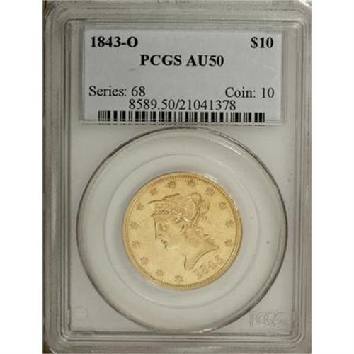 <B>1843-O $10 AU50 PCGS.</B></I> This early O-mint eagle is lightly worn across the highpoints of the design. Some rub and scattered abrasions are also seen in the fields, but both sides are remarkably free of sizeable blemishes. Warm reddish-orange color overlies more deeply set green-gold hues.<BR><BR><B>Coin Engraver:</B> Christian Gobrecht<BR><BR><b>Shipping:</b> Coins & Currency (<a target="_blank" href="http://www.heritageauctions.com/common/shipping.php">view shipping information</a>)