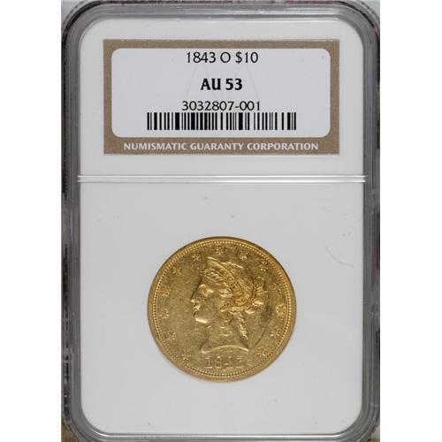<B>1843-O $10 AU53 NGC.</B></I> A crisply struck and moderately abraded example of this collectible No Motto O-mint issue. Pockets of luster glint from both sides, and a bright area near the hair bun is of little import.<BR><BR><b>Shipping:</b> Coins & Currency (<a target="_blank" href="http://www.heritageauctions.com/common/shipping.php">view shipping information</a>)