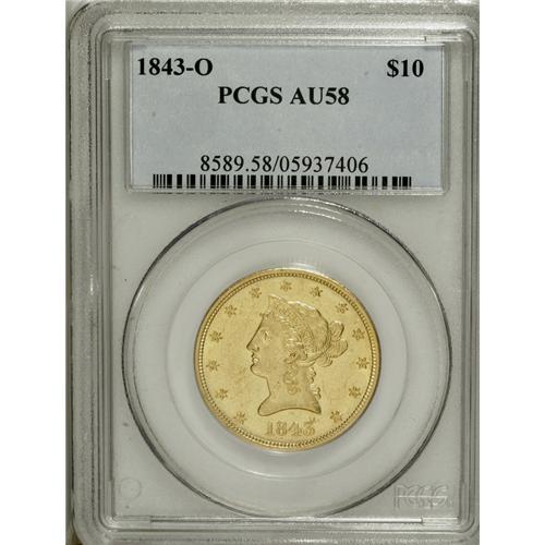 <B>1843-O $10 AU58 PCGS.</B></I> During the 1840s it almost appears as if the Philadelphia Mint (in its second facility since 1833) were competing with the New Orleans Mint (completed in 1839, although it struck its first silver coins in 1838). The two mints regularly flip-flop the record for most eagles coined during the decade. In 1843 New Orleans grabbed the laurel, with an eagle emission of 175,000-plus pieces, more than double Philadelphia's 75,000 coins. AU pieces are nonetheless scarce, and Mint State examples are rare. The present coin boasts boldly struck greenish-yellow surfaces with much prooflikeness and even more eye appeal. Population: 4 in 58, 6 finer (4/07).<BR><BR><b>Shipping:</b> Coins & Currency (<a target="_blank" href="http://www.heritageauctions.com/common/shipping.php">view shipping information</a>)