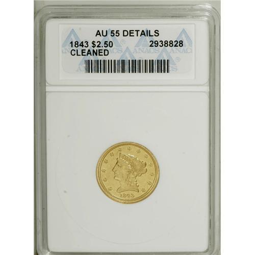 <B>1843-O $2 1/2 Small Date, Crosslet 4--Cleaned--ANACS. AU55 Details.</B></I> This consistently minutely granular piece is well struck and appears free from friction, although the luster is diminished. ANACS has incorrectly certified the piece as an 1843 Philadelphia issue.<BR><I>From The Twin Hollows Collection, Part Two.</B></I><BR><BR><b>Shipping:</b> Coins & Currency (<a target="_blank" href="http://www.heritageauctions.com/common/shipping.php">view shipping information</a>)