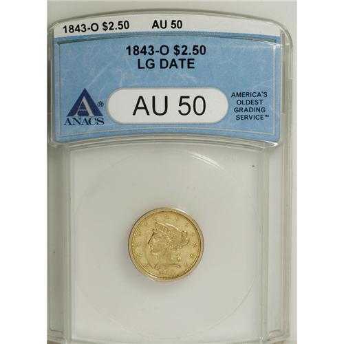 <B>1843-O $2 1/2 Large Date, Plain 4 AU50 ANACS.</B></I> NGC Census: (16/120). PCGS Population (3/14). Mintage: 76,000. (#7732)<BR><BR><b>Shipping:</b> Coins & Currency (<a target="_blank" href="http://www.heritageauctions.com/common/shipping.php">view shipping information</a>)