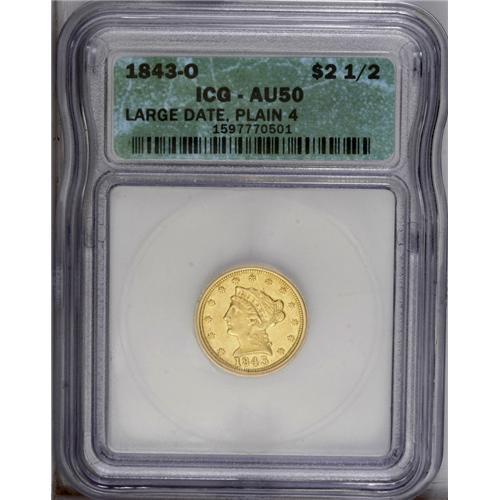 <B>1843-O<$2 1/2> Large Date, Plain 4 AU50 ICG.</B></I> Solidly struck with a trace of highpoint wear on each side. The yellow-gold surfaces display significant handling marks from light circulation.