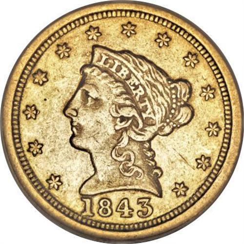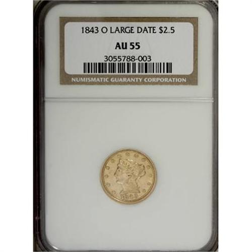 <B>1843-O $2 1/2 Large Date, Plain 4 AU55 NGC.</B></I> The Large Date is rare relative to its Small Date counterpart. This straw-gold O-mint representative has ample luster on the reverse, and luster also fills the date, curls, and coronet on the obverse. The mintmark is repunched south. Census: 17 in 55, 42 finer (1/08).<BR><BR><B>Coin Engraver:</B> Christian Gobrecht<BR><BR><b>Shipping:</b> Coins & Currency (<a target="_blank" href="http://www.heritageauctions.com/common/shipping.php">view shipping information</a>)