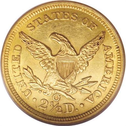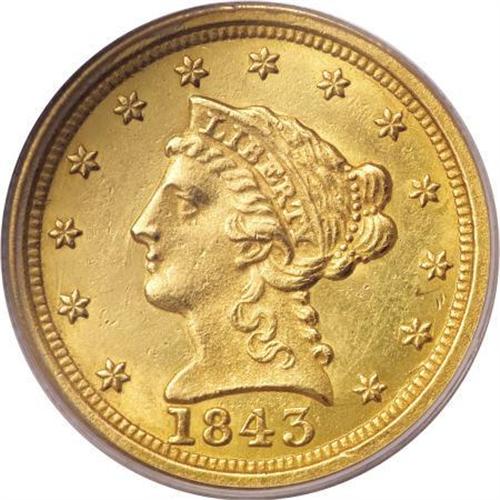 <B>1843-O $2 1/2 Large Date, Plain 4 MS61 PCGS.</B></I> Liberty's neck is heavily rusted and the mintmark is sharply doubled, both characteristics of this rare and important variety. Most gold specialists agree that only about a dozen Mint State pieces are known. This specimen is fully lustrous with frosty yellow surfaces and sharp design details. A few scattered marks are visible, but the eye appeal is much higher than expected for the grade. Population: 4 in 61, 2 finer (8/07).<BR><BR><B>Coin Engraver:</B> Christian Gobrecht<BR><BR><b>Shipping:</b> Coins & Currency (<a target="_blank" href="http://www.heritageauctions.com/common/shipping.php">view shipping information</a>)