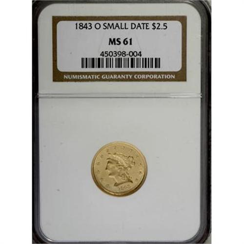 <B>1843-O $2 1/2 Small Date, Crosslet 4 MS61 NGC.</B></I> A lustrous yellow-gold example of this variety, the more common of two design variants from the New Orleans Mint in 1843 (the other being the Large Date, Plain 4 type). Softly struck on the eagle, with numerous tiny, grade-limiting marks. Mint State examples are scarce.<BR><BR><B>Coin Engraver:</B> Christian Gobrecht<BR><BR><b>Shipping:</b> Coins & Currency (<a target="_blank" href="http://www.heritageauctions.com/common/shipping.php">view shipping information</a>)