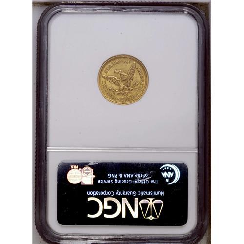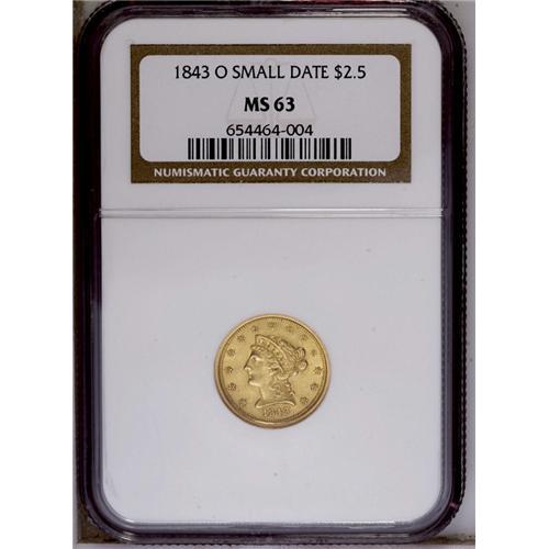 <B>1843-O<$2 1/2> Small Date, Crosslet 4 MS63 NGC.</B></I> In 1843, the New Orleans Mint produced quarter eagles with Small and Large Dates, distinguished by having a Crosslet 4 or Plain 4 respectively. The Small Date is considerable more common. While we are not sure what basis exists in fact, Walter Breen recorded specific mintages of 288,002 Small Date coins and 76,000 Large Date coins. This example is a highly lustrous and frosty greenish-gold example with some design weakness. The surfaces are exceptional, despite a few miniscule abrasions. Struck from worn dies with die cracks, rust lumps, and flowlines on each side. Census: 8 in 63, 3 finer (3/06). <BR><BR><B>Important notice:</B> Heritage usually auctions material at the rate of 200-250 lots per hour. On some occasions eBay Live bid software or the Internet may not be able to keep up with the pace of the auction. We recommend placing a realistic absentee bid now as insurance to avoid disappointment. Occasionally the auctioneer may eliminate or reject an eBay Live bid, and the auctioneer may also reopen a lot after the close of the eBay live bidding (usually because we missed an audience bid), and may reject your bid even if it shows you as the winning bidder. By bidding via eBay Live, you agree that Heritage may award the lot to another bidder at its sole discretion under the circumstances described above or any other reasonable circumstances. Since eBay bids are not shown to us until we open the lot on the floor, we treat those bids just like floor bids. In most cases the floor responds before the eBay bid is presented to us, due to Internet lag time, so for consistency we have made it a policy that floor bids are always considered first over tie eBay live bids. Also please note that all Heritage lots purchased through eBay Live carry a 20% Buyer's Premium. Please make sure you read the Terms and Conditions before you bid. This lot is being auctioned in conjunction with a live floor auction by Heritage Galleries & Auctioneers. All final auction and invoice information will be supplied by Heritage Galleries & Auctioneers, and all other information should be considered preliminary. Lot:2365 <BR><BR><B>Winning Notification and Billing:</B> After the FINAL session in this auction is complete, Heritage will send e-mail and snail mail invoices. This process normally takes several days. All final auction and invoice information will be supplied by Heritage Galleries & Auctioneers, and all other information should be considered preliminary. <BR><BR>This auction will be conducted on a live auction floor and over the Internet through eBay Live. If you choose to place an absentee bid, please take a moment to <font color='#0000ff'><u><a href='http://pages.ebay.com/liveauctions/help/before/laabsentee.html'>learn how eBay Live absentee bidding works</a></u></font><font color='#000000'>