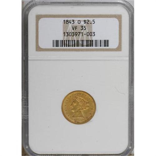 <B>1843-O $2 1/2 Small Date, Crosslet 4 VF35 NGC.</B></I> NGC Census: (13/499). PCGS Population (16/203). Mintage: 288,002. Numismedia Wsl. Price for NGC/PCGS coin in VF35: $236. (#7731)<BR><BR><B>Coin Engraver:</B> Christian Gobrecht<BR><BR><b>Shipping:</b> Coins & Currency (<a target="_blank" href="http://www.heritageauctions.com/common/shipping.php">view shipping information</a>)