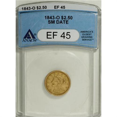 <B>1843-O $2 1/2 Small Date, Crosslet 4 XF45 ANACS.</B></I> NGC Census: (76/395). PCGS Population (48/122). Mintage: 288,002. Numismedia Wsl. Price for NGC/PCGS coin in XF45: $285. (#7731)<BR><BR><B>Coin Engraver:</B> Christian Gobrecht<BR><BR><b>Shipping:</b> Coins & Currency (<a target="_blank" href="http://www.heritageauctions.com/common/shipping.php">view shipping information</a>)