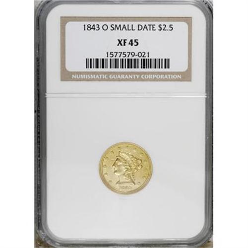 <B>1843-O $2 1/2 Small Date, Crosslet 4 XF45 NGC.</B></I> NGC Census: (77/407). PCGS Population (48/123). Mintage: 288,002. Numismedia Wsl. Price for NGC/PCGS coin in XF45: $285. (#7731)<BR><BR><B>Coin Engraver:</B> Christian Gobrecht<BR><BR><b>Shipping:</b> Coins & Currency (<a target="_blank" href="http://www.heritageauctions.com/common/shipping.php">view shipping information</a>)