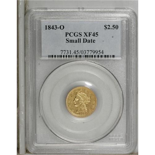 <B>1843-O $2 1/2 Small Date, Crosslet 4 XF45 PCGS.</B></I> PCGS Population (47/121). NGC Census: (76/378). Mintage: 288,002. Numismedia Wsl. Price for NGC/PCGS coin in XF45: $285. (#7731)<BR><BR><b>Shipping:</b> Coins & Currency (<a target="_blank" href="http://www.heritageauctions.com/common/shipping.php">view shipping information</a>)