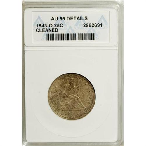 <B>1843-O 25C --Cleaned--ANACS. AU55 Details.</B></I> Small O. A slightly glossy New Orleans quarter with dappled honey-gold and mauve toning. Slight wear is noted on Liberty's highpoints, but considerable luster is present.<BR><BR><b>Shipping:</b> Coins & Currency (<a target="_blank" href="http://www.heritageauctions.com/common/shipping.php">view shipping information</a>)