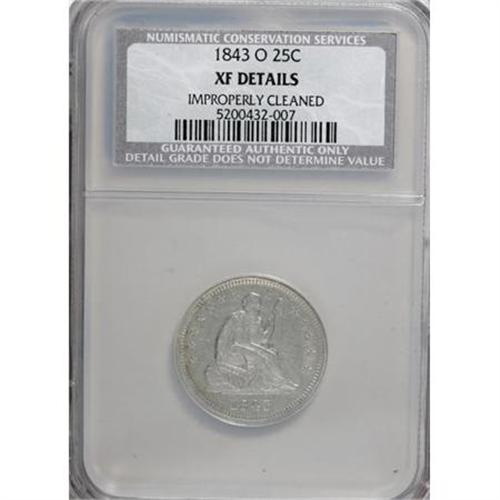 <B>1843-O 25C --Improperly Cleaned--NCS. XF Details.</B></I> NGC Census: (0/0). PCGS Population (0/0). Mintage: 968,000. (#5405)<BR><BR><B>Coin Engraver:</B> Christian Gobrecht<BR><BR><b>Shipping:</b> Coins & Currency (<a target="_blank" href="http://www.heritageauctions.com/common/shipping.php">view shipping information</a>)