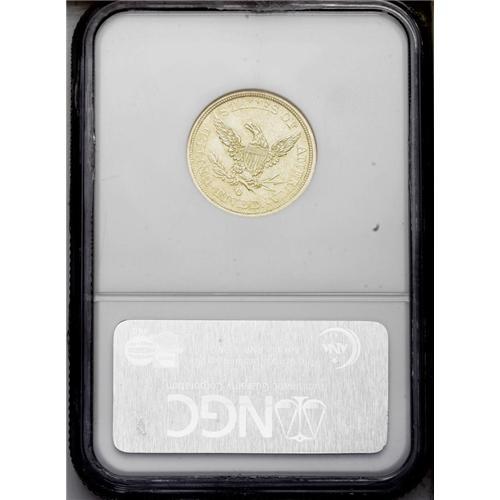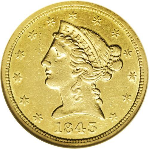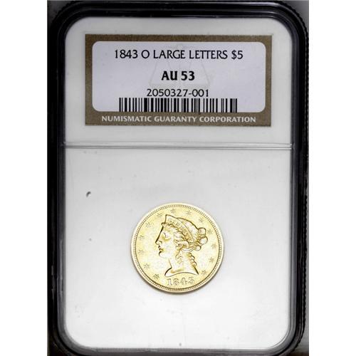 <B>1843-O<$5> Large Letters AU53 NGC.</B></I> Most easily recognized as the Large Letters variety by the placement of the O mintmark above the VE of FIVE. The mintage of this early New Orleans half eagle is a comparatively high 101,075 pieces, but survivors in AU and finer condition are infrequently offered. This bright, satiny representative is very well struck for an O-mint and displays a spindly die crack from Liberty's uppermost curl, through star 6, and into the border. <BR><BR><B>Important notice:</B> Heritage usually auctions material at the rate of 200-250 lots per hour. On some occasions eBay Live bid software or the Internet may not be able to keep up with the pace of the auction. We recommend placing a realistic absentee bid now as insurance to avoid disappointment. Occasionally the auctioneer may eliminate or reject an eBay Live bid, and the auctioneer may also reopen a lot after the close of the eBay live bidding (usually because we missed an audience bid), and may reject your bid even if it shows you as the winning bidder. By bidding via eBay Live, you agree that Heritage may award the lot to another bidder at its sole discretion under the circumstances described above or any other reasonable circumstances. Since eBay bids are not shown to us until we open the lot on the floor, we treat those bids just like floor bids. In most cases the floor responds before the eBay bid is presented to us, due to Internet lag time, so for consistency we have made it a policy that floor bids are always considered first over tie eBay live bids. Also please note that all Heritage lots purchased through eBay Live carry a 20% Buyer's Premium. Please make sure you read the Terms and Conditions before you bid. This lot is being auctioned in conjunction with a live floor auction by Heritage Galleries & Auctioneers. All final auction and invoice information will be supplied by Heritage Galleries & Auctioneers, and all other information should be considered preliminary. Lot:2669 <BR><BR><B>Winning Notification and Billing:</B> After the FINAL session in this auction is complete, Heritage will send e-mail and snail mail invoices. This process normally takes several days. All final auction and invoice information will be supplied by Heritage Galleries & Auctioneers, and all other information should be considered preliminary. <BR><BR>This auction will be conducted on a live auction floor and over the Internet through eBay Live. If you choose to place an absentee bid, please take a moment to <font color='#0000ff'><u><a href='http://pages.ebay.com/liveauctions/help/before/laabsentee.html'>learn how eBay Live absentee bidding works</a></u></font><font color='#000000'>