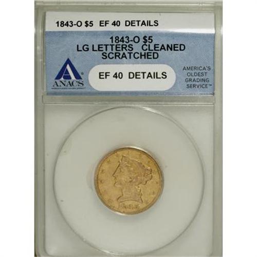 <B>1843-O $5 Large Letters--Cleaned, Scratched--ANACS. XF40 Details.</B></I> NGC Census: (15/114). PCGS Population (13/37). Mintage: 101,075. Numismedia Wsl. Price for NGC/PCGS coin in XF40: $900. (#8216)<BR><BR><B>Coin Engraver:</B> Christian Gobrecht<BR><BR><b>Shipping:</b> Coins & Currency (<a target="_blank" href="http://www.heritageauctions.com/common/shipping.php">view shipping information</a>)