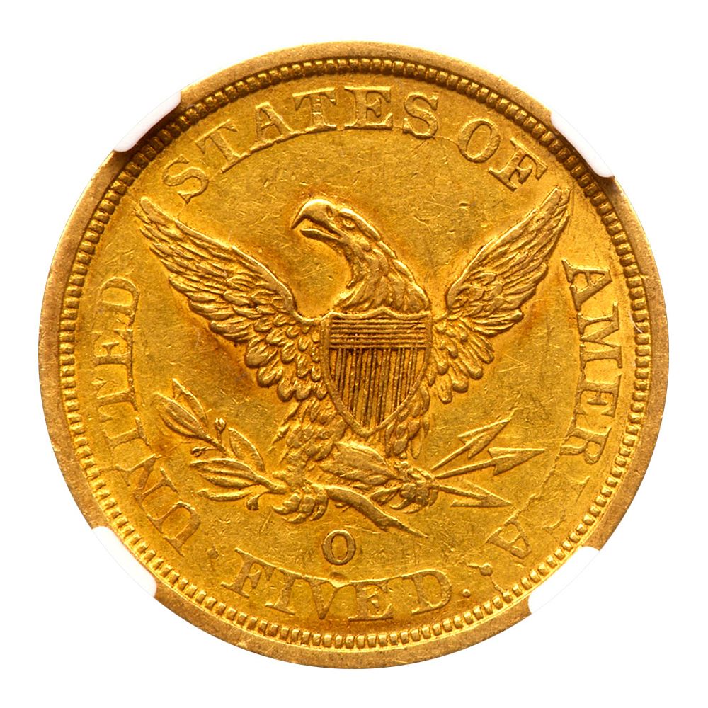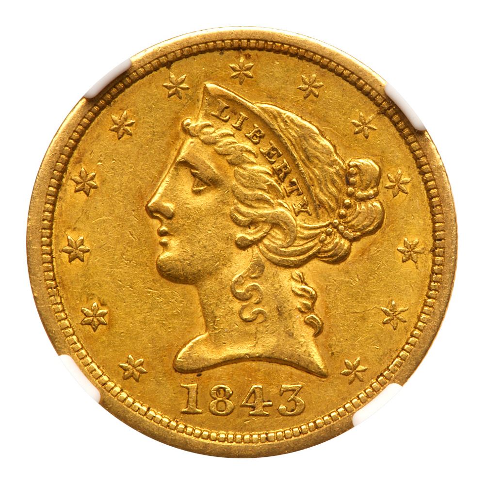 1843-O. Large letters. NGC graded AU-53. CAC. PQ. Well struck and nice for the grade with highly appealing smooth surfaces, only gentle circulation and rich orange gold color from decades of careful storage. The eye appeal on this coin is simply outstanding. A true collectors coin with fantastic surfaces. The Large Letters style seems to be more plentiful than the Small Letters, but both are quite rare in any Mint State grade. Only 82,000 struck. Pop 7; 60 finer at NGC. PCGS # 8216 Estimated Value 2,100 - 2,200