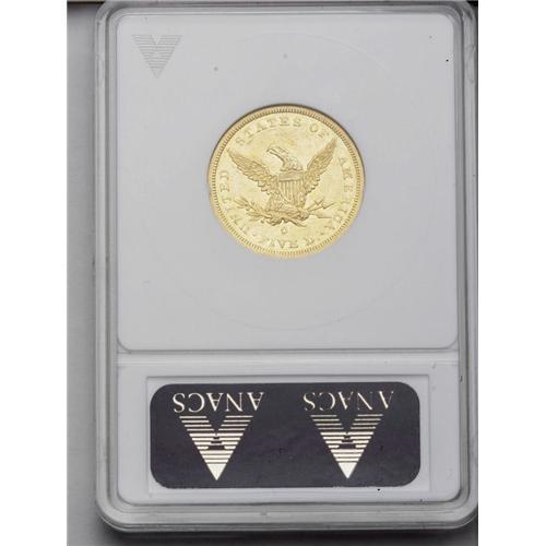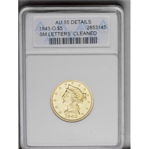 <B>1843-O<$5> Small Letters--Cleaned--ANACS. AU55 Details.</B></I> An unnaturally bright but sharp example with light wear on the eyebrow, shoulder, and nostril of Liberty. A rare O-mint variety; the <I>Guide Book</B></I> reports a production of 19,075 pieces.