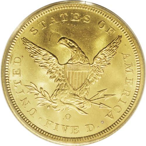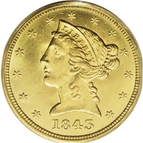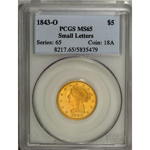 <B>1843-O $5 Small Letters MS65 PCGS.</B></I> The mintage that is generally quoted for the Small Letters 1843-O is 19,075 pieces. Breen's quote about this issue from his 1988 <I>Encyclopedia</B></I> remains true today: "Very rare in EF; Ex. rare above. A few 'seawater Uncs;' prohibitively rare full Unc." Only eight Uncirculated coins have been certified in the various grades of Mint State with this piece tied with a single NGC coin for finest graded. (Of course, it is always possible that the NGC coin could be this same coin that was crossed over to PCGS and has not been removed from the <I>Census Report</B></I>). This is definitely <B>not</B></I> one of the "seawater Uncs" Breen referred to that were salvaged from a Confederate transport. The surfaces are bright and sparkle with mint luster just as they did when John Tyler was president. As with many branch mint coins from this era, this coin has fields that are borderline reflective, which give it even more vibrancy and "life." The details are also very well defined with only slight softness noted on Liberty's hair curls, the eagle's neck, and claws. As one would expect for an MS65, there are no distracting blemishes on either side. For pedigree purposes, however, we note a diagonal mark in the obverse field out from stars 1 and 2, and another between stars 5 and 6.<BR> Astute collectors have begun to appreciate the absolute as well as the conditional scarcity of New Orleans gold. For some reason, it has not received the notoriety or the press of Charlotte and Dahlonega gold. Yet, it is every bit as rare as its C and D-mint counterparts. This amazing coin is an opportunity awaiting a savvy collector who appreciates the finest and the rarest while also recognizing an undervalued issue. We believe that this is the PCGS MS65 listed by Doug Winter in his 2006 update of <I>Gold Coins of the New Orleans Mint,</B></I> yet, clearly it is not the same as the Bowers and Merena March 2000 coin, lot 2393 in that sale.<BR><BR><b>Shipping:</b> Coin/Currency (<a target="_blank" href="http://www.heritageauctions.com/common/shipping.php">view shipping information</a>)