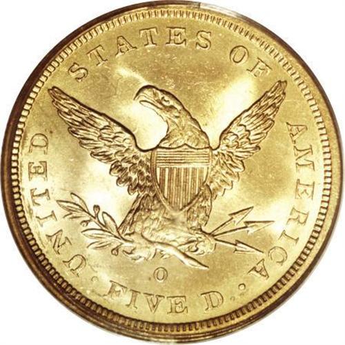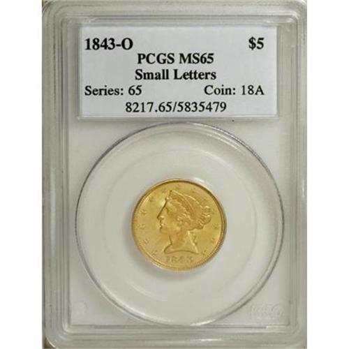 <B>1843-O $5 Small Letters MS65 PCGS.</B></I> The mintage that is generally quoted for the Small Letters 1843-O is 19,075 pieces. Breen's comment about this issue from his 1988 <I>Encyclopedia</B></I> remains true today: "Very rare in EF; Ex. rare above. A few 'seawater Uncs;' prohibitively rare full Unc." Only seven Uncirculated coins have been certified in the various grades of Mint State, with this piece tied with a single NGC coin for finest graded. It is possible that the NGC coin could be this same coin, crossed over to PCGS and left within the <I>Census Report, </B></I>since no NGC MS65 examples have appeared at auction<I>.<BR> </B></I>On the present piece, the surfaces are bright and sparkle with mint luster just as they did when John Tyler was president. As with many branch mint coins from this era, this coin has fields that are borderline reflective, which give it even more vibrancy and "life." The details are also very well defined with only slight softness noted on Liberty's hair curls, the eagle's neck, and claws. As one would expect for an MS65, there are no distracting blemishes on either side. For pedigree purposes, however, we note a hair-thin diagonal mark in the obverse field out from stars 1 and 2, and another between stars 5 and 6.<BR> Astute collectors have begun to appreciate the absolute as well as the conditional scarcity of New Orleans gold. For some reason, these issues have not received the notoriety or the press of Charlotte and Dahlonega gold, with the exception of several very rare O-mint double eagles. The present magnificent Gem is an opportunity awaiting a savvy collector who appreciates the finest and the rarest while also recognizing an undervalued issue.<BR> We believe that this is the PCGS MS65 listed as finest known by Doug Winter in his 2006 update of <I>Gold Coins of the New Orleans Mint. </B></I>However, his provenance is incorrect. The present piece first emerged as lot 2251 of the August 2000 Bowers and Merena auction, where it was described as one of four pieces from the same source, all in nice Mint State. The other three pieces were also auctioned by Bowers in Merena that year, as lot 2252 in August 2000 and as lots 2392 and 2393 in March 2000. These four pieces are also the four finest known, with fifth place taken by the Eliasberg example. The MS61 PCGS example, listed as #5 in the Winter census, is actually a Large Letters variety, as can be seen from its photo as lot 2667 of the Bowers and Merena Baltimore ANA auction catalog.<BR><BR><B>Coin Engraver:</B> Christian Gobrecht<BR><BR><b>Shipping:</b> Coins & Currency (<a target="_blank" href="http://www.heritageauctions.com/common/shipping.php">view shipping information</a>)