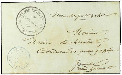 1843 Pre-stamp envelope to the ISLAND OF MARIE-GALANTE written from POINTE-A-PITRE and cancelled by SERVICE DES PONTS ET CHAUSSEES/GUADELOUPE (Jamet No 11) routed via Basse-Terre with transit in blue to Joinville. Superb item.