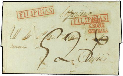 1843 Pre-stamp envelope written from MALTA and forwarded via Gibraltar with hand-struck GIB. S. ROQUE AND. BAXA transit in red to CADIZ. The bearer has deposited the envelope at the Spanish Post Office in Cadiz with all the mail from THE PHILIPPINES. The envelope has been cancelled twice with the boxed FILIPINAS in red and taxed "52 R" in manuscript with CADIZ arrival on reverse and two disinfection slits. Extremaly scarce and possibly unique item.